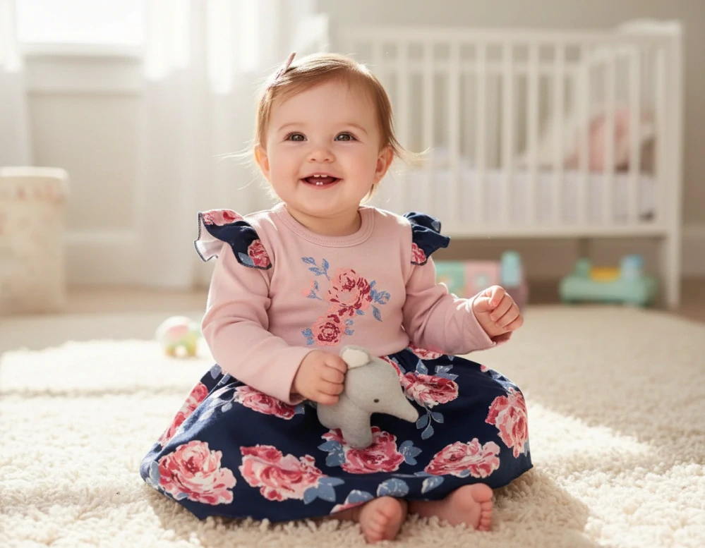 body s dlouhým rukávkem, sukýnkou, rukávky zdobené kanýrky, vzor růžiček. Zachovává výhodu bodynka, krásně drží plenku, pohodlné oblékání i přebalování. Zapínání na ramínku i mezi nožičkami na baby druky. Čelenka Růžička PU modrá není součástí.