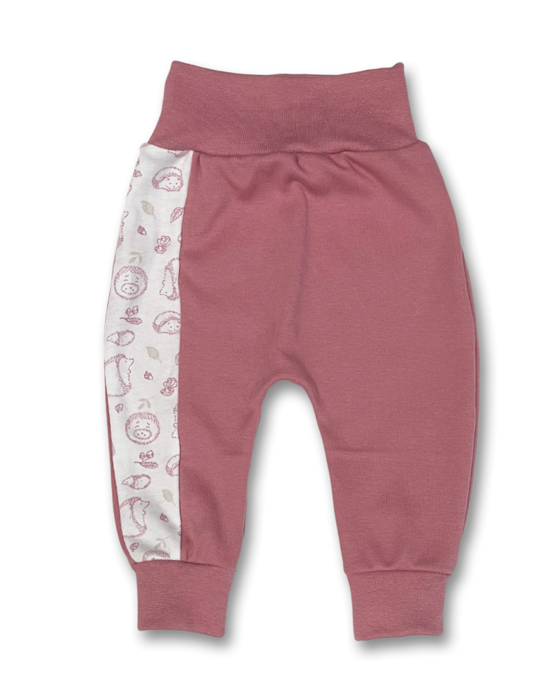 tepláčky jsou vyrobené z příjemné jemné bavlny v barvě pudrová růž s lampasem - potisk ježečků, pohodlný pružný pas netlačí na citlivé bříško miminka, ukončení tepláčků pružnou manžetou.
