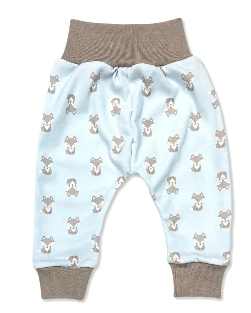 tepláčky jsou vyrobené z příjemné jemné bavlny v modré barvě v kombinaci kapučíno - potisk lištiček, pohodlný pružný pas netlačí na citlivé bříško miminka, ukončení tepláčků pružnou manžetou.