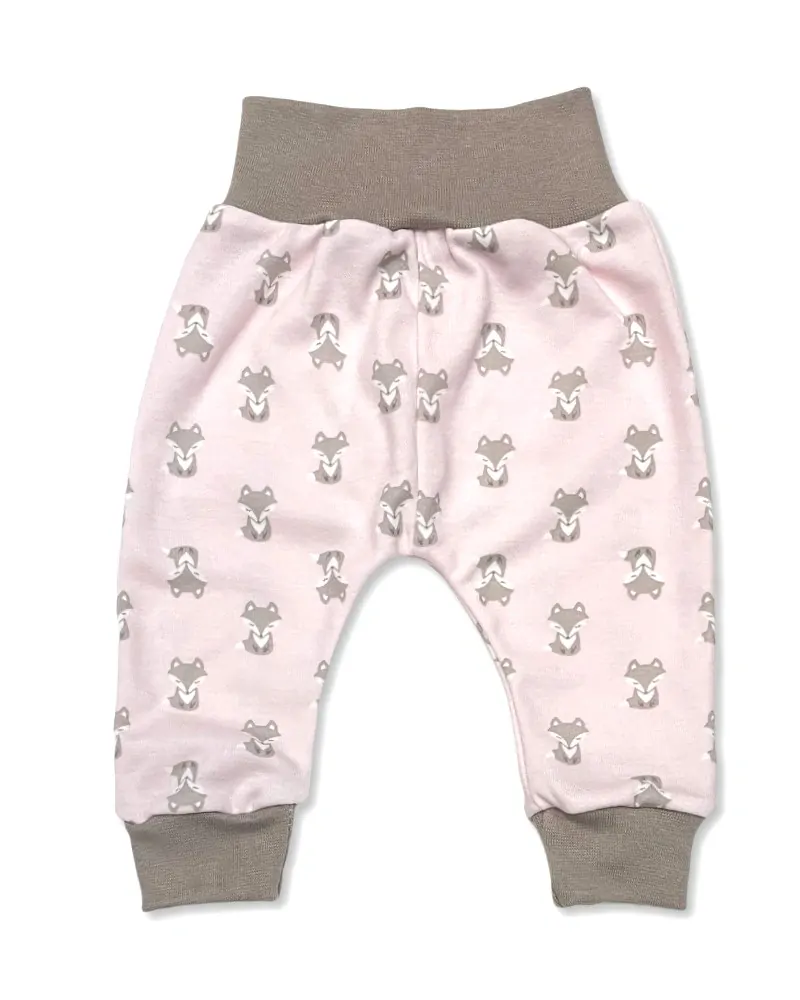 tepláčky jsou vyrobené z příjemné jemné bavlny v růžové barvě v kombinaci kapučíno - potisk lištiček, pohodlný pružný pas netlačí na citlivé bříško miminka, ukončení tepláčků pružnou manžetou.