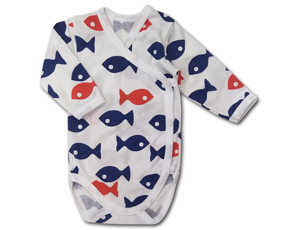 zapínání na baby druky po celé délce na boku i mezi nožičkami,velmi usnadňuje oblékání ipřebalování miminka, dvojitá látka na přední části skvěle ochrání citlivé bříško kojence, který se v něm bude cítit velmi příjemně. krásný potisk modrých a červených rybiček.