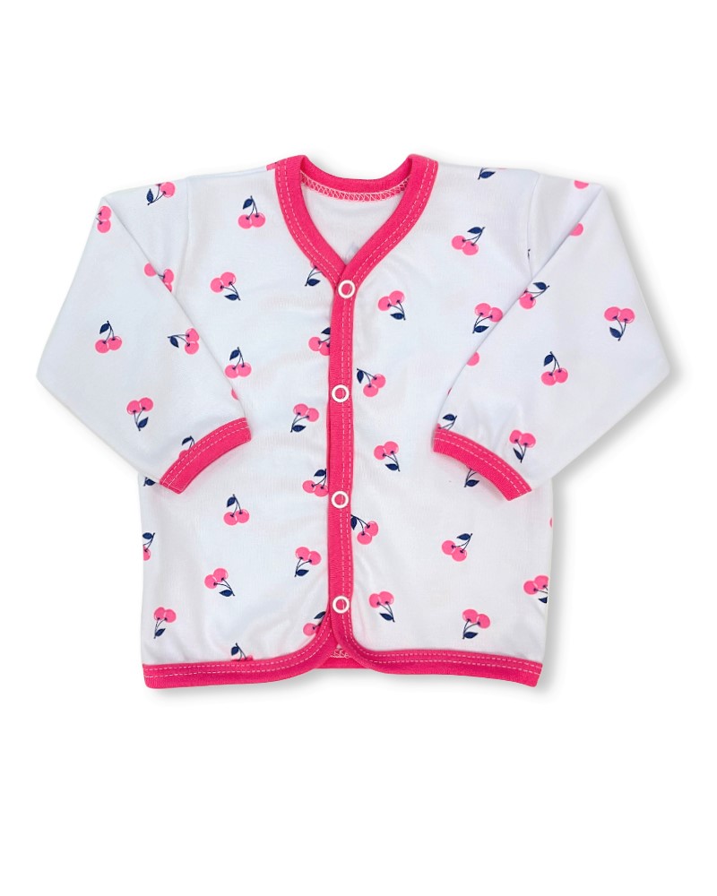 Kabátek je ideální pro nejmenší miminka, vyroben z kvalitní bavlny, která nedráždí pokožku dítěte. Kabátek zdobí potisk třešniček . Praktické zapínání na baby druky po celé délce uprostřed.
