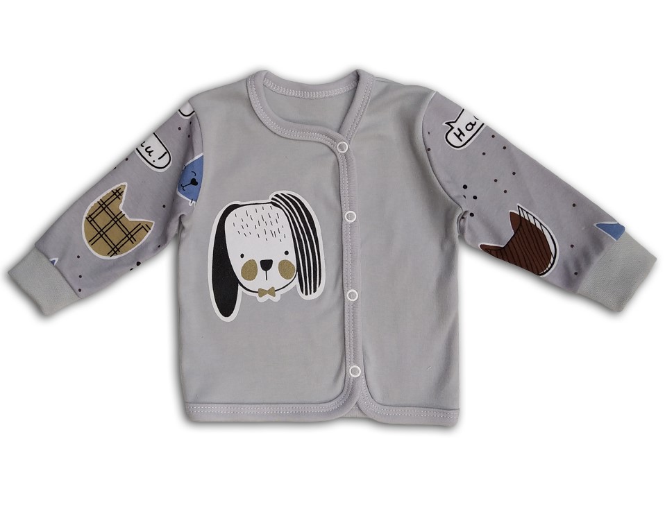 Kabátek je ideální pro nejmenší miminka, vyroben z kvalitní bavlny, která nedráždí pokožku dítěte. Kabátek zdobí obrázek hafíčka, rukávky s potiskem zvířátek. Praktické zapínání na baby druky po celé délce na boku.