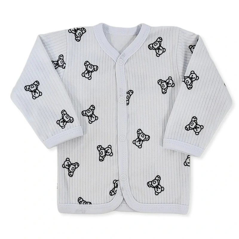 Kabátek je ideální pro nejmenší miminka, vyroben z jemné kvalitní žebrované bavlny, která nedráždí pokožku dítěte. Kabátek zdobí obrázky medvídka Brumlík. Praktické zapínání na baby druky po celé délce uprostřed.