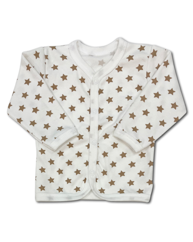 Kabátek je ideální pro nejmenší miminka, vyroben z jemné kvalitní bavlny, která nedráždí pokožku dítěte. Kabátek zdobí hvězdičky. Praktické zapínání na baby druky po celé délce uprostřed.