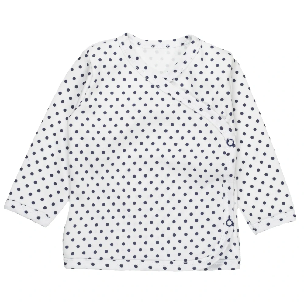 jemná příjemná bavlna bílo modrý puntík, zapínání kabátku na boku.