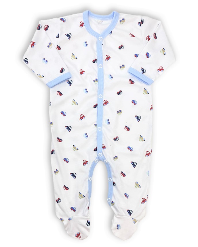 overálek je vyroben z příjemné jemné bavlny s obrázky autíček, světle modré lemování, zapínání uprostřed i mezi nožičkami na baby druky - usnadňuje pohodlné oblékání i přebalování novorozených miminek - není nutné přetahovat přes hlavičku.