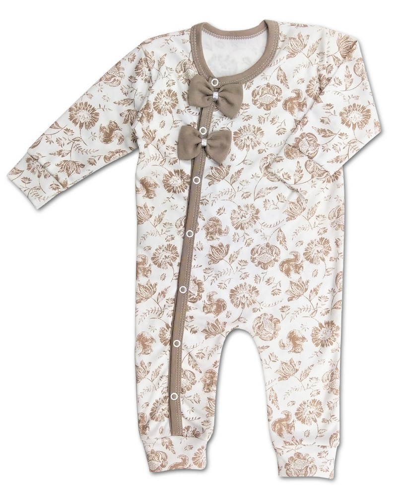 overal s krásným vzorem květinek a veverek v barvě kapučíno, zdobený mašličkami, zapínání po celédélce na boku na baby druky.