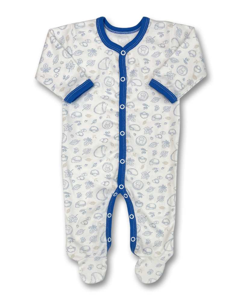 overálek je vyroben z příjemné jemné bavlny ideální pro miminka, zapínání uprostřed na baby druky - usnadňuje pohodlné oblékání i přebalování novorozených miminek - není nutné přetahovat přes hlavičku. Overal zdobí obrázky ježečků, lemování modré.