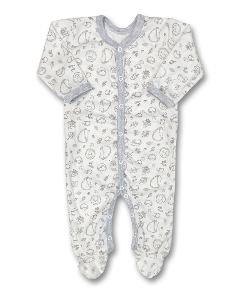 overálek je vyroben z příjemné jemné bavlny ideální pro miminka, zapínání uprostřed na baby druky - usnadňuje pohodlné oblékání i přebalování novorozených miminek - není nutné přetahovat přes hlavičku. Overal zdobí obrázky ježečků, šedá.