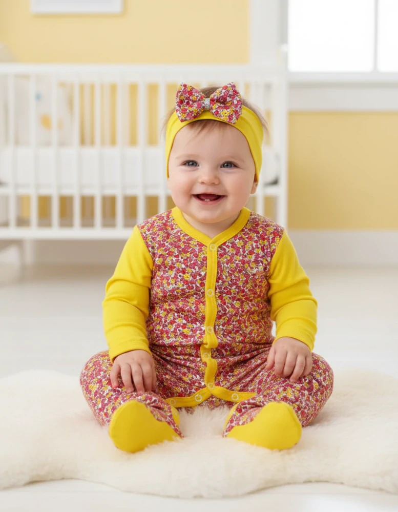 overálek je vyroben z příjemné bavlny s květinkami, rukávky a lemování v barvě lemon, zapínání uprostřed i mezi nožičkami na baby druky - usnadňuje pohodlné oblékání i přebalování novorozených miminek - není nutné přetahovat přes hlavičku.