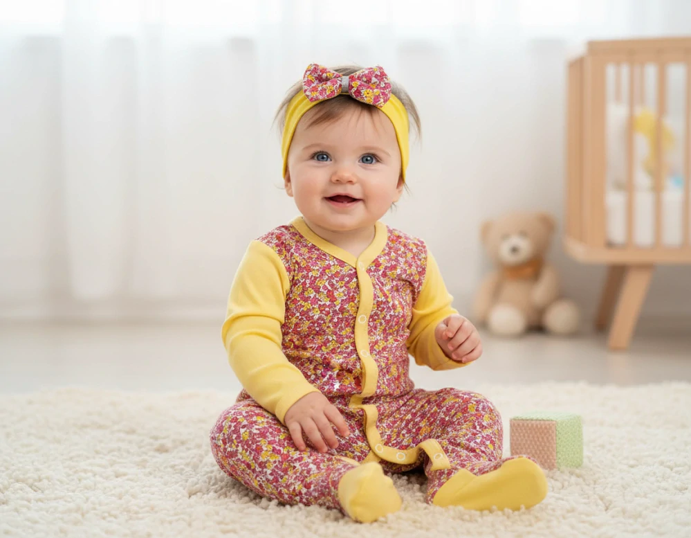overálek je vyroben z příjemné bavlny s růžových a žlutých kvítků, rukávky a lemování žluté, zapínání uprostřed i mezi nožičkami na baby druky - usnadňuje pohodlné oblékání i přebalování novorozených miminek - není nutné přetahovat přes hlavičku.