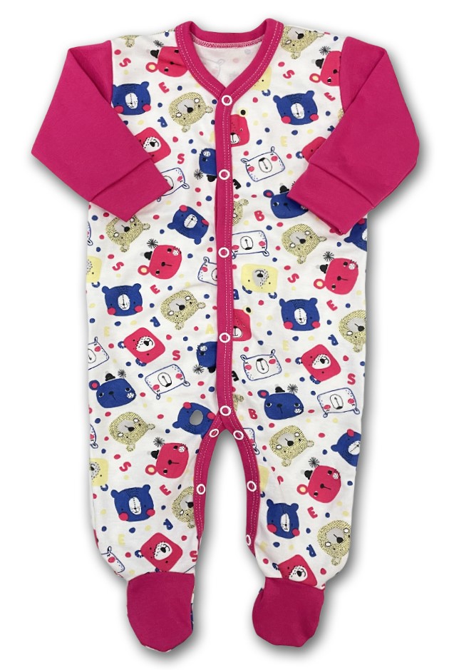 overálek je vyroben z příjemné jemné bavlny s obrázky hlaviček medvídků, lemování a rukávky v barvě amarant, zapínání uprostřed i mezi nožičkami na baby druky - usnadňuje pohodlné oblékání i přebalování novorozených miminek - není nutné přetahovat přes hlavičku.