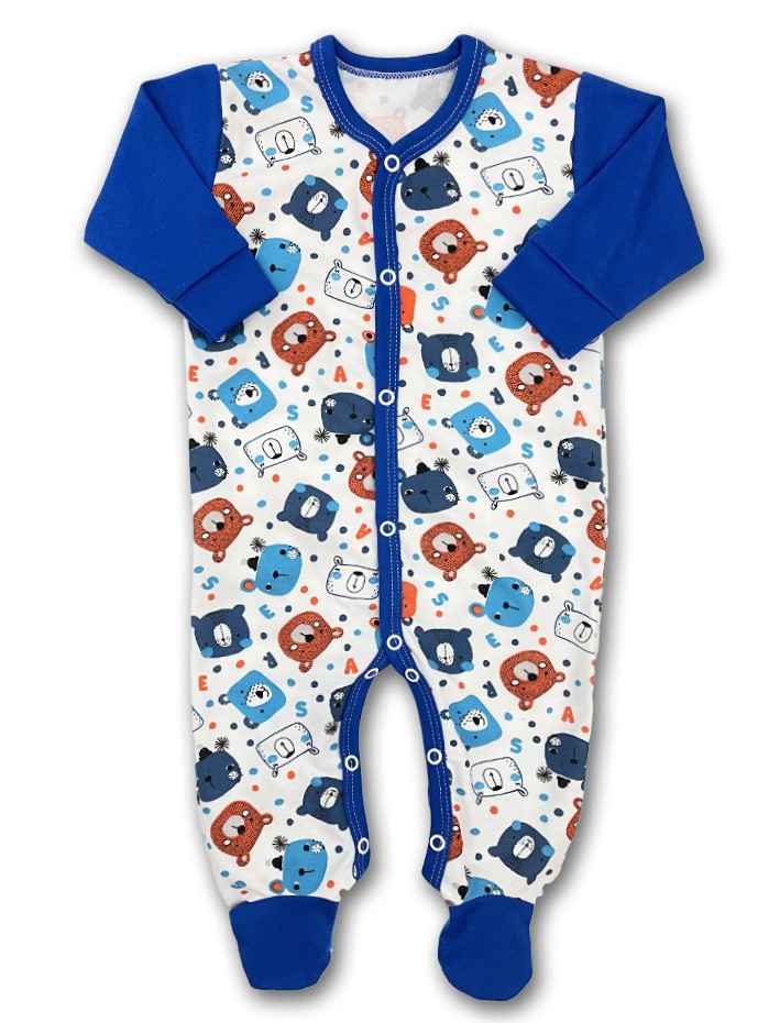 overálek je vyroben z příjemné jemné bavlny s obrázky hlaviček medvídků, lemování a rukávky v barvě modrá, zapínání uprostřed i mezi nožičkami na baby druky - usnadňuje pohodlné oblékání i přebalování novorozených miminek - není nutné přetahovat přes hlavičku.