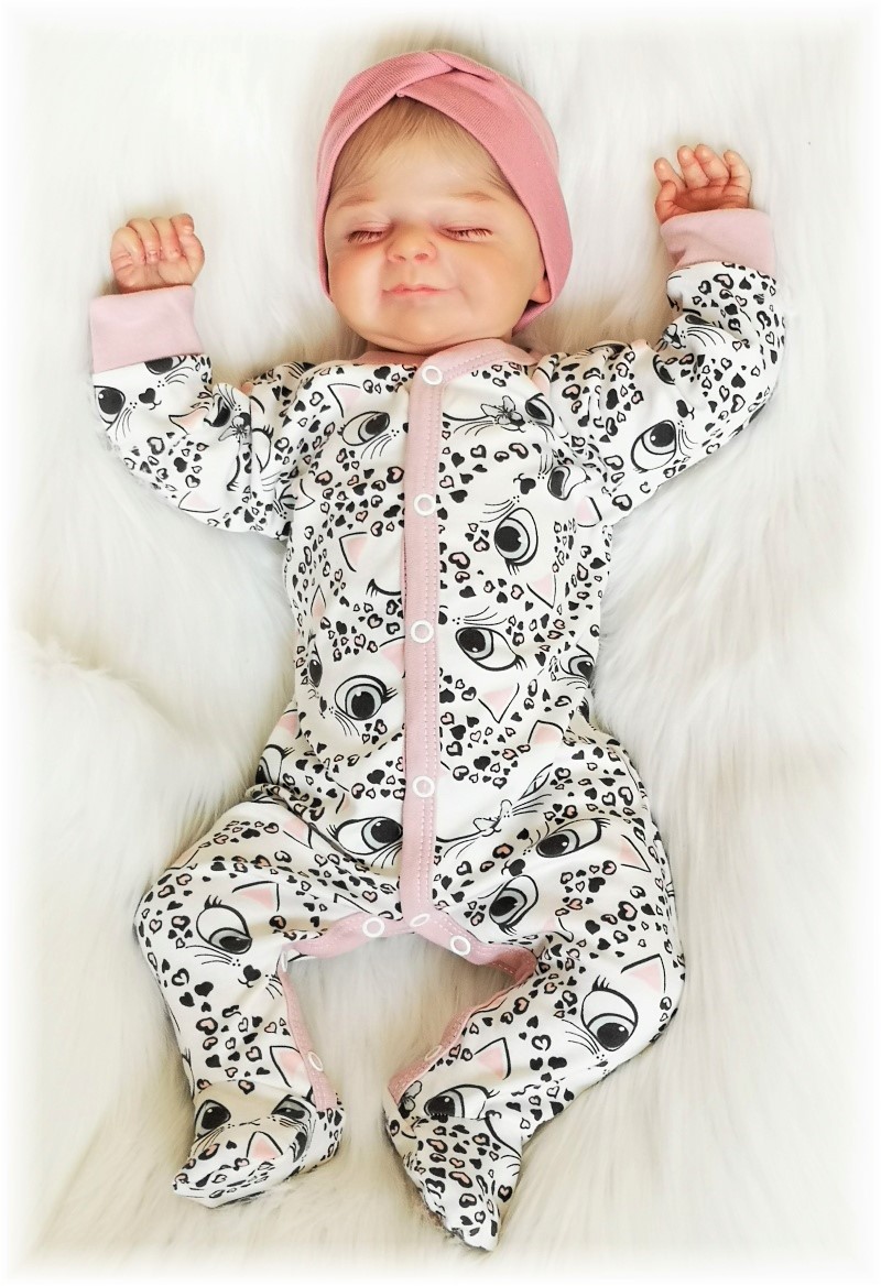 overálek pro miminko je vyroben z příjemné jemné bavlny s obrázky koťátek a srdíček, zapínání uprostřed i mezi nožičkami na baby druky - usnadňuje pohodlné oblékání i přebalování novorozených miminek - není nutné přetahovat přes hlavičku.
