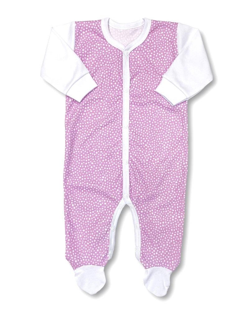 overálek je vyroben z příjemné jemné bavlny s bílými puntíky na růžovém podkladu, zapínání uprostřed i mezi nožičkami na baby druky - usnadňuje pohodlné oblékání i přebalování novorozených miminek - není nutné přetahovat přes hlavičku.