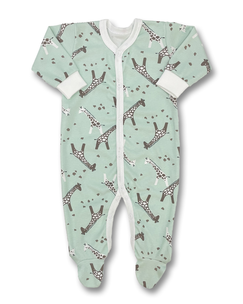 overálek je vyroben z příjemné jemné bavlny s obrázky žirafek, zapínání uprostřed i mezi nožičkami na baby druky - usnadňuje pohodlné oblékání i přebalování novorozených miminek - není nutné přetahovat přes hlavičku.