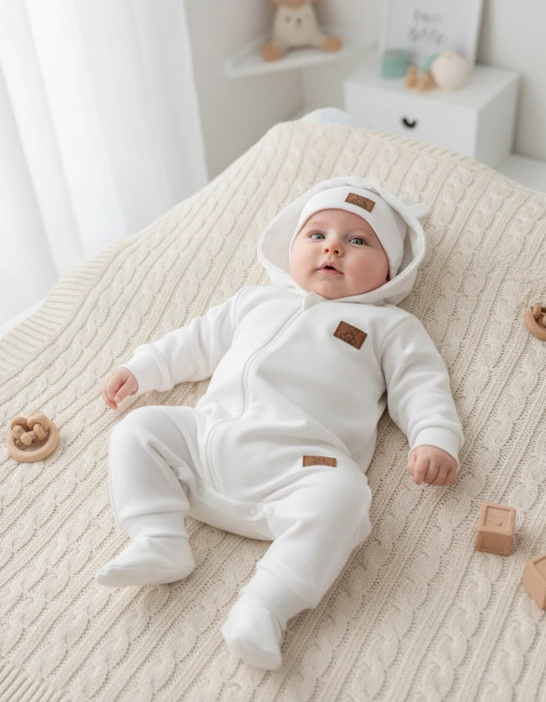pohodlný overal z kvalitního materiílu, který je ideální pro vaše děťátko od narození. Praktické zapínání po celé délce na boku na zip, zip u krčku krytý. Dvojitou kapucku zdobí roztomilá ouška. Rukávky i ukončení nohaviček pružným nápletem. Overálek doplňují capáčky s ohrnovacím pružným lemem a čepička.