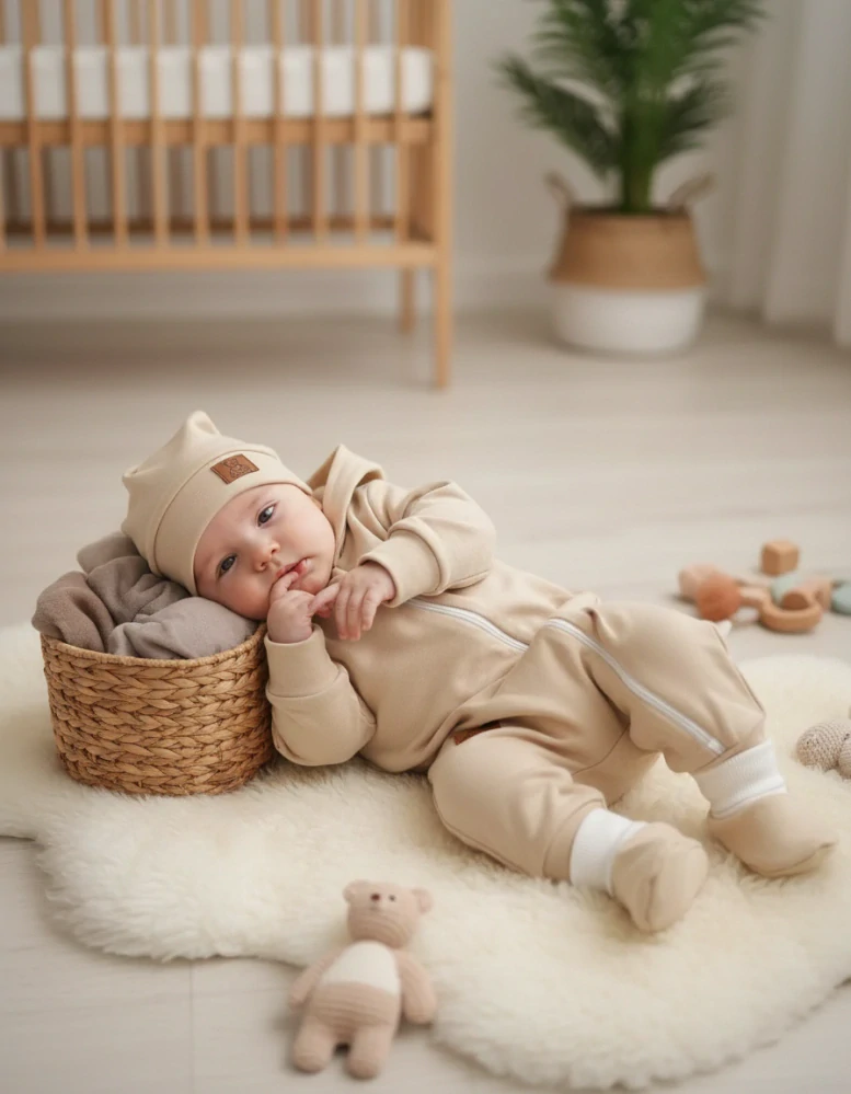Teplákový overálek pro miminko s čepičkou a capáčky Brumlík káva