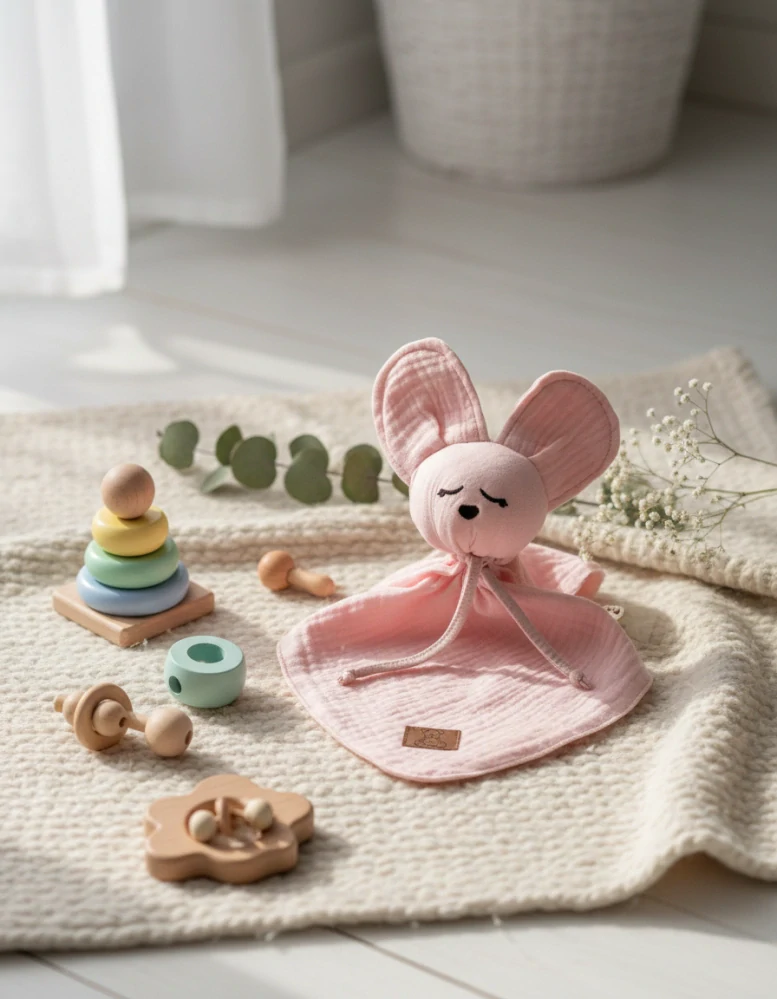 roztomilá hračka stvořena k uklidnění miminka, pomáhá navodit pocit bezpečí. Mazlíček z příjemné kvalitní bio bavlny - mušelínu má ideální velikost, pro malé dětské ručičky. V hlavičce chrastítko. Na koncích lze uvázat uzlíky, které mají miminka velmi v oblibě.
