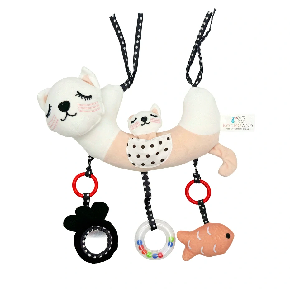 Hračka kombinuje různé textury (plyš, hladká látka, plast) a barvy (pastelové s černou, bílou a červenou). Toto složení dokonale podporuje koordinaci oko-ruka a povzbuzuje děti k protahování paží.